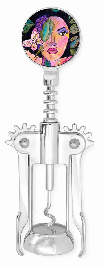Measurements: 2 3/8" x 6 3/4" with a 1.5" round 2-sided decorated top. Winged metal Corkscrew...