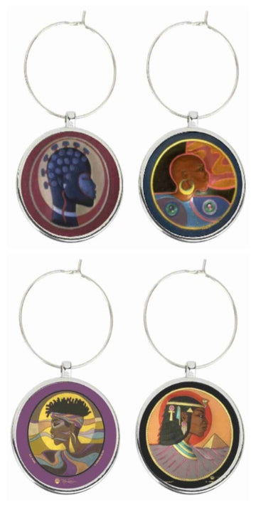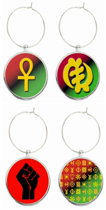 Tired of losing track of your glass at gatherings? Our wine glass charms, four designs to a set, are here to help. Designed to blend function with style, these glass charms for wine glasses are adorned with African American art and symbols that spark conversation and admiration. Not only do they prevent mix-ups, because of the four designs, but they also add a refined touch to your wine glasses. Ideal for dinner parties, family events, or special occasions, these wine stem charms make each glass memorable. Each person has their own design. Choose wine glass jewelry that reflects your heritage and elevates your hosting game effortlessly.