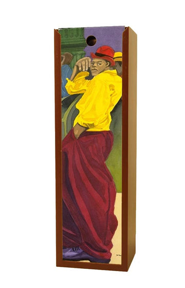 Our Wine Bottle Boxes have a rosewood exterior finish & decorated sliding hardboard door that feature African American Art & Symbols. Holds a standard wine bottle (750ml). Our boxes have silky smooth black satin fabric interior.