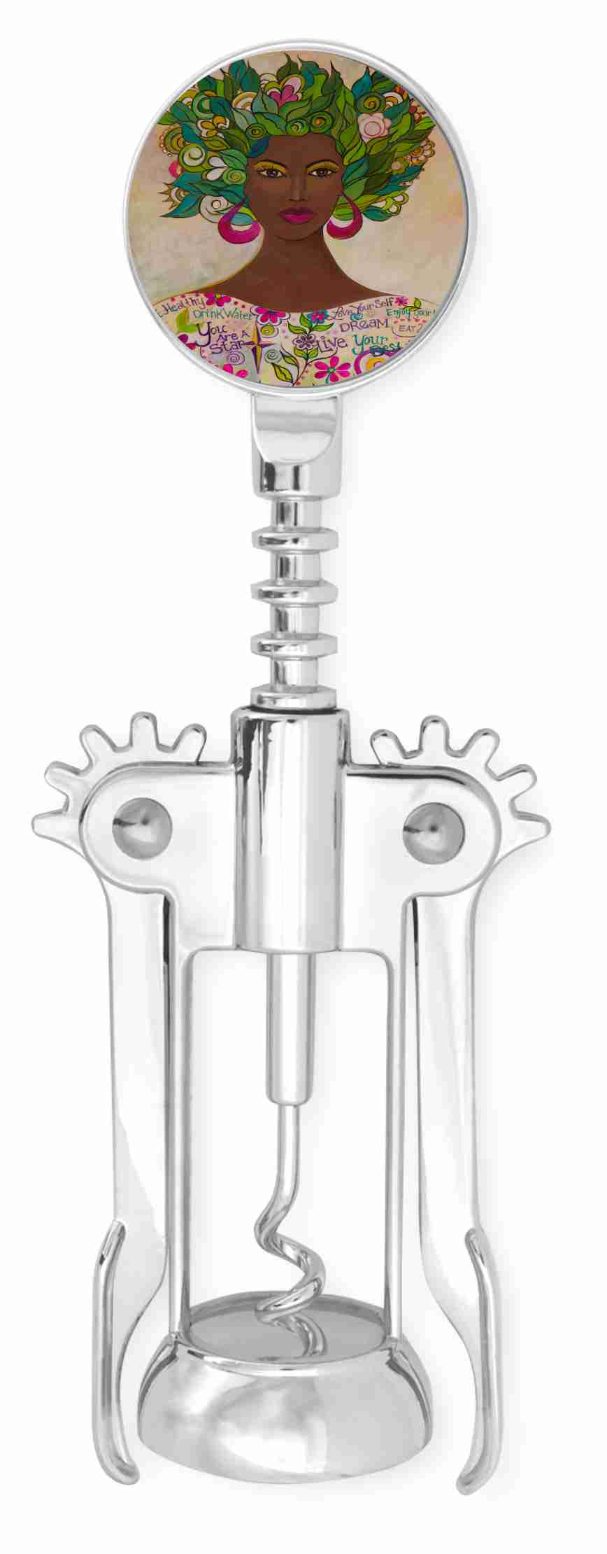 Winged metal Corkscrew (Wine Bottle Opener or Cork Puller) with a round 2-sided matching decorated top. Use to draw corks out of wine bottles.
