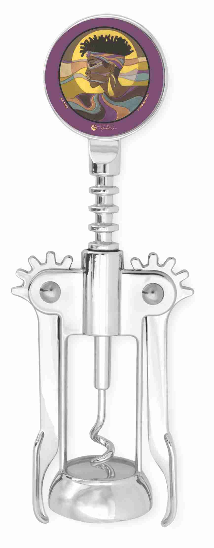Winged metal Corkscrew (Wine Bottle Opener or Cork Puller) with a round 2-sided matching decorated top. Use to draw corks out of wine bottles.